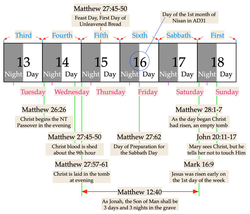 The timeline above shows the days of the 1st month during the Passover and Unleavened Bread season in AD 31 when Christ instituted the New Testament Passover and willingly gave Himself to be crucified, to shed His blood for the covering of sin, and then to be raised up after 3 nights and 3 days in the grave.